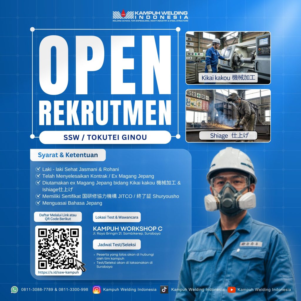 Kampuh Welding Indonesia membuka peluang bagi Ex Magang Jepang khususnya bidang Maching (Kikai kakō) & Finishing (Shiage) yang ingin kembali bekerja di Jepang sebagai Tokutei Ginou